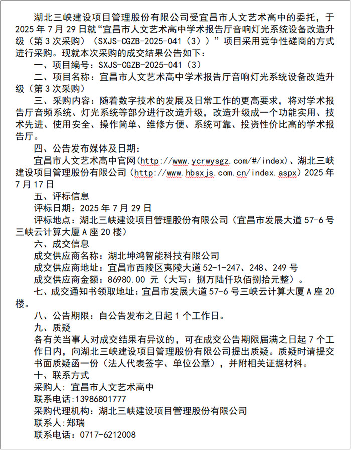 | 宜昌市人文藝術(shù)高中學(xué)術(shù)報告廳音響燈光系統(tǒng)設(shè)備改造升級(第3次采購)成交結(jié)果公告 |