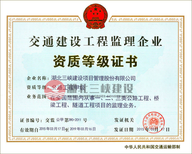 交通建設(shè)工程監(jiān)理企業(yè)資質(zhì)等級證書
