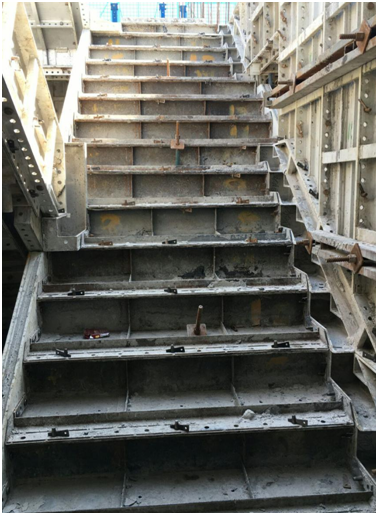 梯間踏步鋁模安裝。該部位砼澆筑時(shí),震動棒斜插入踏步鋁模內(nèi)進(jìn)行振搗。踏步鋁模上有排氣孔,砼振搗時(shí),便于氣體排除,提高砼質(zhì)量