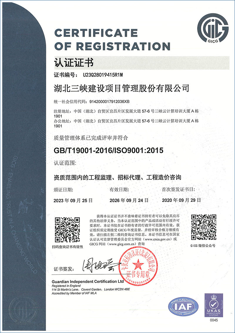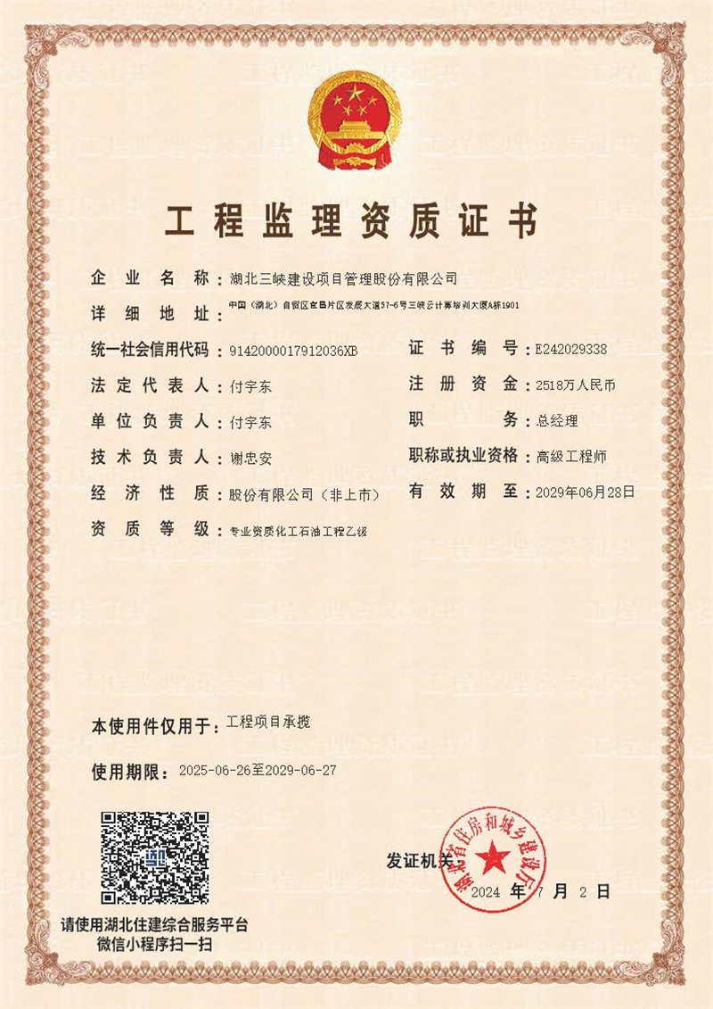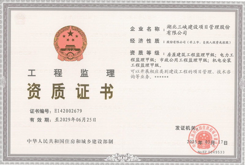 湖北三峽建設項目管理股份有限公司立足湖北宜昌,業(yè)務范圍遍及新疆、云南、福建、廣東等省市,為投資人提供了誠信、科學、公正的項目管理咨詢服務。公司注重以人為本,匯聚了專業(yè)、敬業(yè)、廉潔的人才隊伍,擁有全國注冊監(jiān)理工程師120余人、一級造價師20余人、一級建造師30余人、咨詢工程師(投資)10余人;公司致力以標準為證,公司研發(fā)的信息管理系統獲國家版權局計算機軟件著作權證;公司追求以價值為魂,鑄就了全過程控制、全要素服務的工作作風,所承擔的項目獲國家級建基,形成了履責行為規(guī)范和風險管理機制,質量管理、環(huán)境管理、職業(yè)健康安全管理獲ISO9001、ISO14001、 ISO 45001管理體系認設工程質量安全獎7項、省級建設工程質量安全獎100余項,市級建設工程質量安全獎300余項,合同履約率100%,項目優(yōu)良率42%。